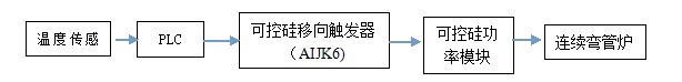 溫度傳感器測出連續(xù)彎管爐內(nèi)的實時溫度后給PLC,與PLC的設(shè)定值比較后輸出一個4-20mA的電流信號給可控硅移向觸發(fā)器,可控硅移向觸發(fā)器輸出觸發(fā)信號給可控硅功率模塊從而精確控制連續(xù)彎管爐內(nèi)的溫度。