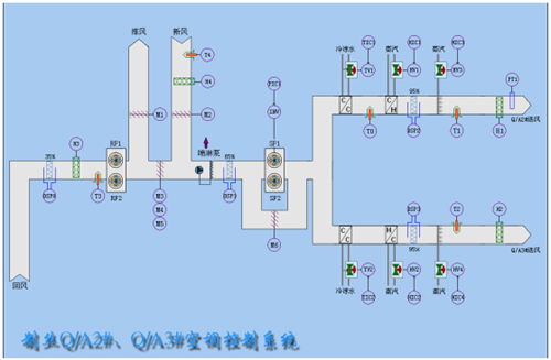 在上位監(jiān)控微機上顯示中央空調的整個工作狀態(tài),如工藝流程圖、動畫構件、空氣流動塊、過程參數、安紐設置。
