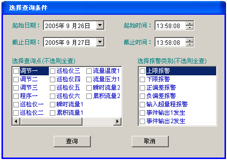 (3)報警:變頻器、溫度、濕度、風壓發(fā)生異常報警時,相應的顯示會發(fā)生閃爍及聲音報警點擊消除;同時選擇各類報警并記錄報表;提供打印功能。