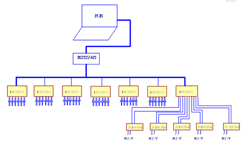 整個空調(diào)數(shù)據(jù)采集、監(jiān)控系統(tǒng)由一臺上位PC機、1個宇電RS232/RS485轉(zhuǎn)換器、7臺AI人工智能高精度6路巡檢儀、37個鉑熱電阻Pt100、4個流量傳感器及一個壓差變送器組成。利用具有通訊功能的AI-706M6路巡檢儀對現(xiàn)場數(shù)據(jù)進行采集,測量精度為0.2級。在巡檢儀上可直接顯示采集的數(shù)據(jù),并通過RS-485串行通訊和上位機進行通訊,實現(xiàn)37個通道溫度、4個通道流量及1個通道壓差的集中監(jiān)控。AI調(diào)節(jié)器上的所有參數(shù)可以在上位機中顯示,也可用上位機設(shè)定下載。