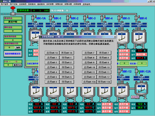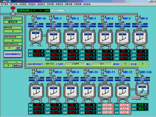 整個系統(tǒng)主要由一臺AI-708H控制14個反應(yīng)釜的批量進料,分別由7臺AI-704M和7臺AI-501精確測量反應(yīng)釜的溫度和電機的電流,所有這些都在主控PC上進行控制和顯示,并由軟件記錄并保存數(shù)據(jù)。