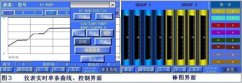 4、圖形豐富:具有豐富的圖形畫面如:1~8通道【數(shù)據(jù)畫面】一目了然;單臺儀表【實時畫面】模擬點信息、曲線、數(shù)據(jù)、手/自動、程序控制、溫度和壓力的畫面進行分組顯示;儀表控制參數(shù)修改操控盡在掌控中;形象的【棒圖畫面】高低楚落;分析工藝參數(shù)實時-歷史可選1~4條曲線組合畫面變化無窮;歷史數(shù)據(jù)報表海量記錄;報警應答報表隨心所悅;工藝流程盡收眼底;